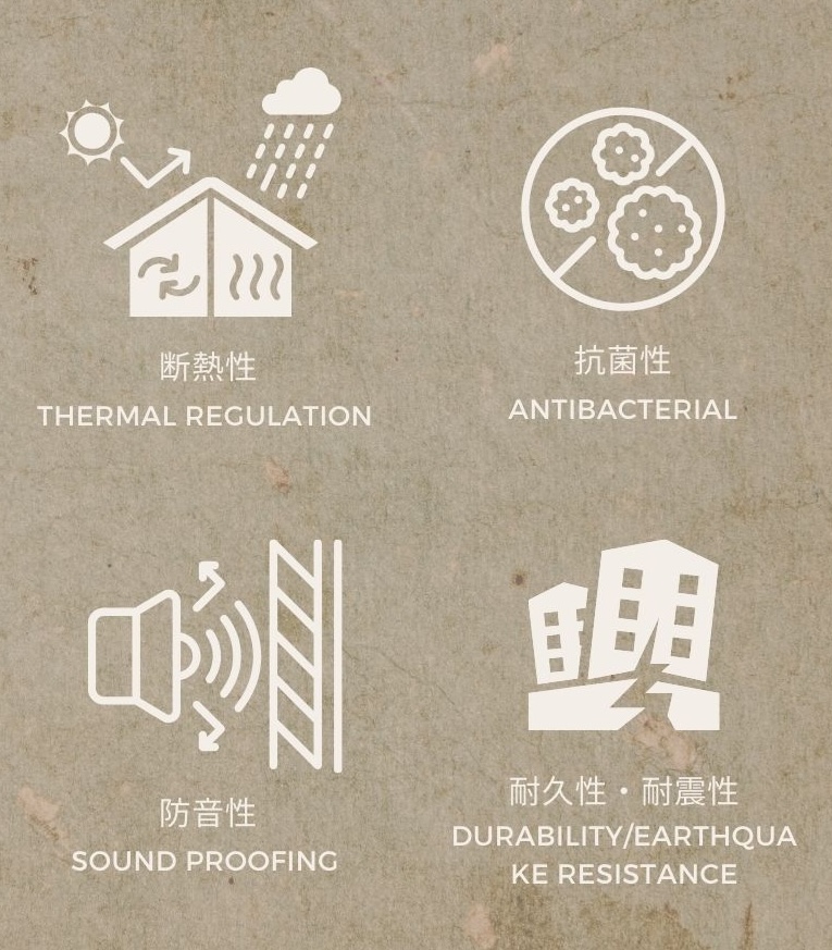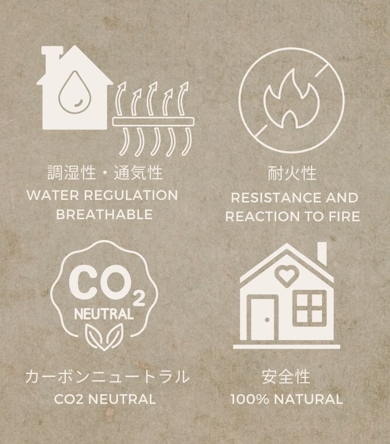 耐震、調湿、防火、通気性、断熱性、抗菌性(防カビ)、築年数、電磁波、エネルギー問題、ゴミ問題など今までの建築の全ての課題を、とってもシンプルな方法で解決でき、さらに波動の高い心地よい空間を創るのに麻という素材が重要な役割を果たします。ヘンプクリートに無限の可能性を感じています。特に私たちの扱うヘンプクリート製品は100%自然素材で、断熱性が高く、耐久性があり、高性能な建物外皮(エンベロープ)を実現するソリューションを提供しています。